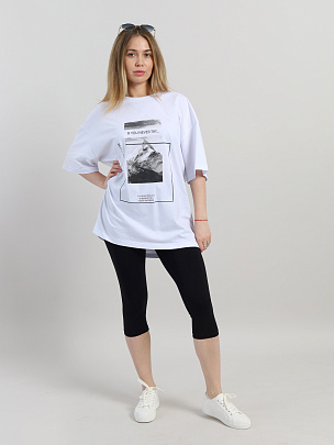Футболка прямого силуэта длиной по линию бедер. Короткий рукав. Круглая горловина обработана узкой притачной обтачкой из рибаны с эластаном. Полочка декорирована принтом "единственный экземпляр".