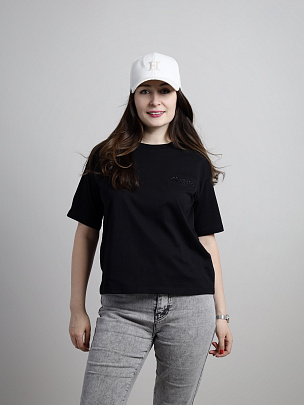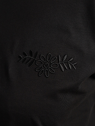 Футболка оверсайз из натурального хлопка. Со спущенными плечами, коротким рукавом. Круглая горловина обработана узкой притачной обтачкой из рибаны с эластаном. Полочка декорирована вышивкой в тон. Длина выше бедра.