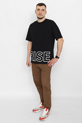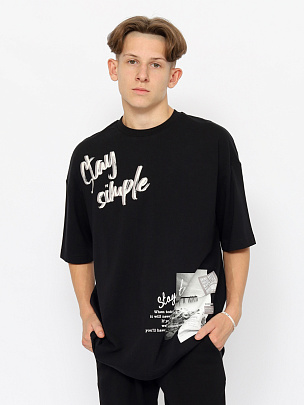 Футболка прямого силуэта длиной до бедер. Короткий рукав. Круглая горловина обработана узкой притачной обтачкой из рибаны с эластаном. Полочка декорирована принтом и текстильной нашивкой "ясное будущее естественное и аутентичное".