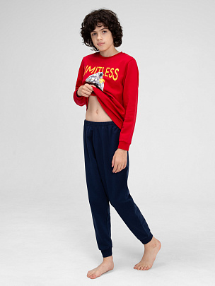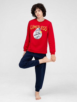 Пижама для мальчика из джемпера и брюк. Джемпер с круглой горловиной и длинными рукавами с манжетами из полотна с добавлением эластана. Брюки без карманов, пояс цельнокроеный с эластичной резинкой внутри. Низ брюк с притачными манжетами из полотна с добавлением эластана. Перед декорирован принтом "Limitless" Безграничный.
