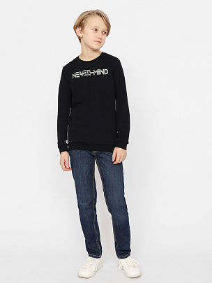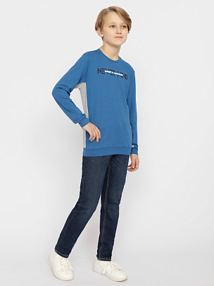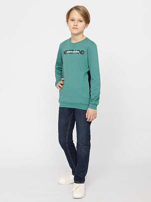 Джемпер для мальчика свободного силуэта с карманом спереди и притачным эластичным поясом по низу. Горловина круглая, обработана притачным воротником из полотна с эластаном. Рукава длинные с эластичными манжетами по низу. Перед джемпера декорирован принтом "Маленькие шаги приводят к большим переменам".