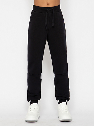 Брюки с притачным поясом и манжетами. В пояс вставлена резинка и функциональный шнур. Пояс и манжеты выполнены из полотна с эластаном. В боковой части брюк располагаются карманы. На передней части в области колена расположен декоративный подрез. На задней части брюк расположена декоративная вставка контрастного цвета. Карман декорирован вязаной нашивкой.