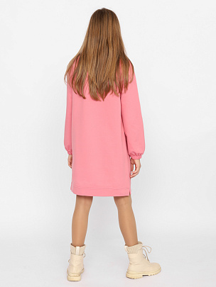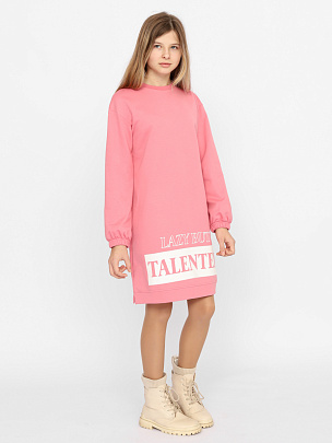 Прямое платье для девочки с длинными рукавами. Рукава широкие, снизу собраны на резинку. Нижние срезы переда и спинки обработаны притачным поясом из основного полотна с разрезами по бокам. В нижней части переда выполнен принт.
