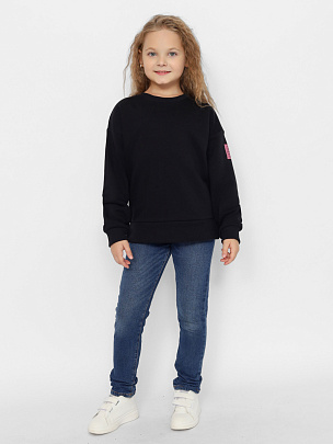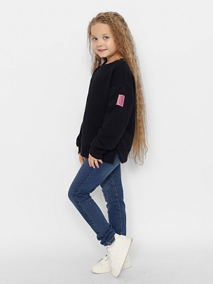 Джемпер для девочки с модным принтом на спинке и нашивкой на рукаве (надпись: "Улыбнись. Настоящий друг всегда в твоем сердце"). Крой оверсайз с заниженной линией плеча, не сковывает движения, позволяя ребенку быть активным. Модель дополнена круглым вырезом горловины и длинными рукавами. Воротник и манжеты выполнены из полотна с эластаном. В боковых швах по низу изделия разрезы.