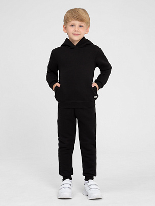 Толстовка для мальчика с капюшоном и карманами в боковых швах. Манжеты и пояс из эластичной рибаны. Внизу на полочке декоративная силиконовая нашивка.