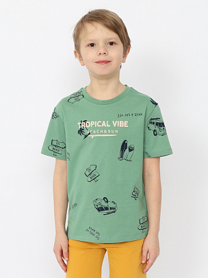 Футболка с коротким рукавом. Горловина круглая, обработана узким воротником из полотна с эластаном. Перед оформлен принтом.