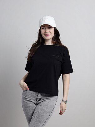 Футболка прямого силуэта с короткими рукавами. Горловина круглая, обработана притачной бейкой из рибаны с лайкрой. Перед футболки декорирован принтом с использованием глиттера.